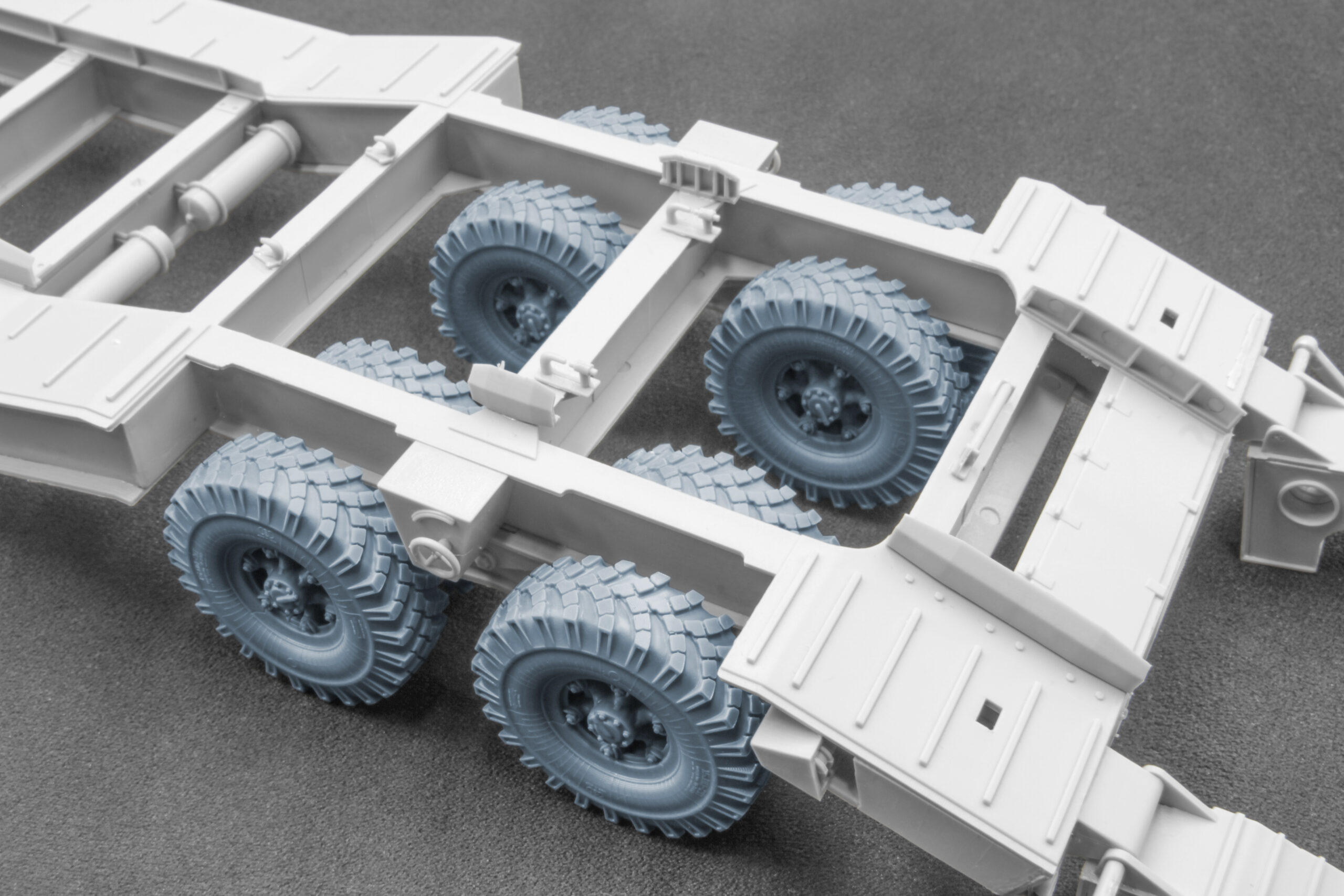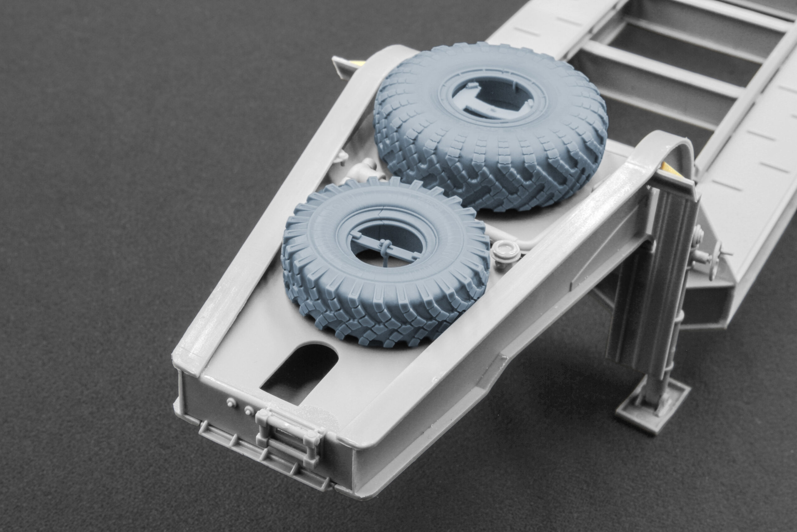 Кожне колесо відтворює реальний прототип із точним малюнком протектора, формою боковин і конструкцією дисків. Ми дослідили численні архівні фото, креслення та технічні матеріали, щоб передати справжню геометрію шин і характерні особливості напівпричепа.
