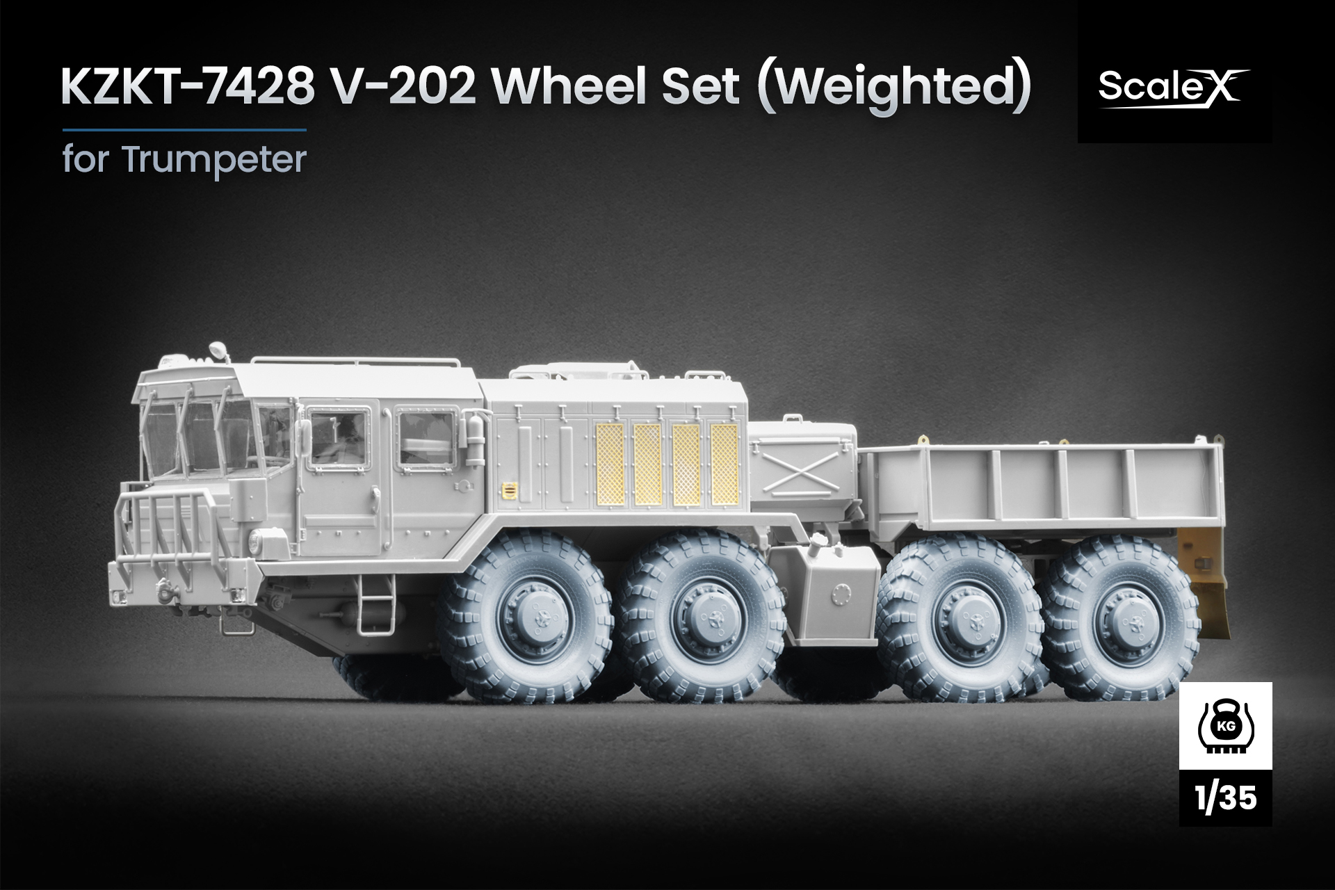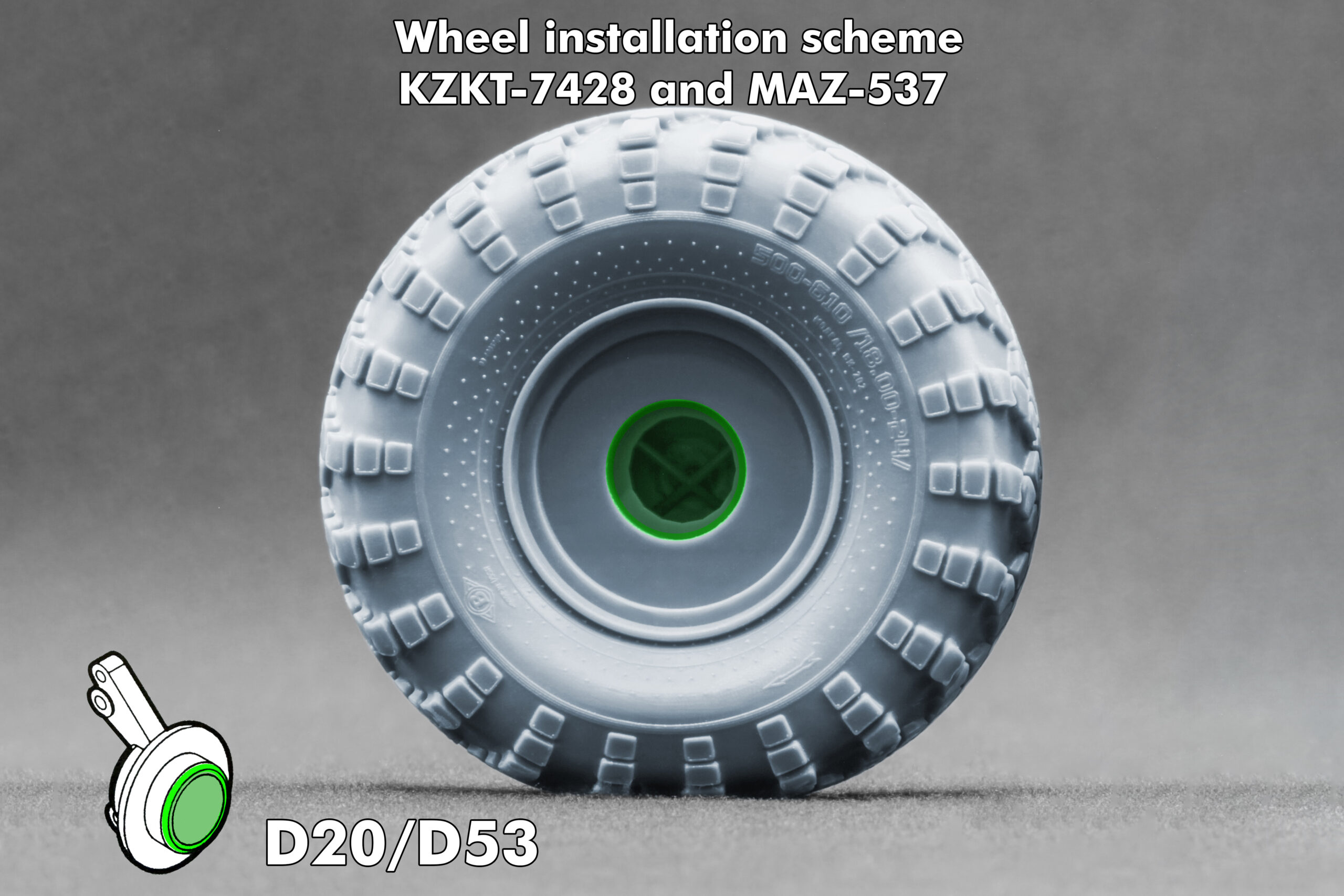 ℹ️ Колеса розроблені для наборів Trumpeter KZKT-7428 у масштабі 1:35 і також можуть використовуватися на техніці MAZ-537, що робить цей набір універсальним варіантом модернізації для кількох моделей радянських важких тягачів.