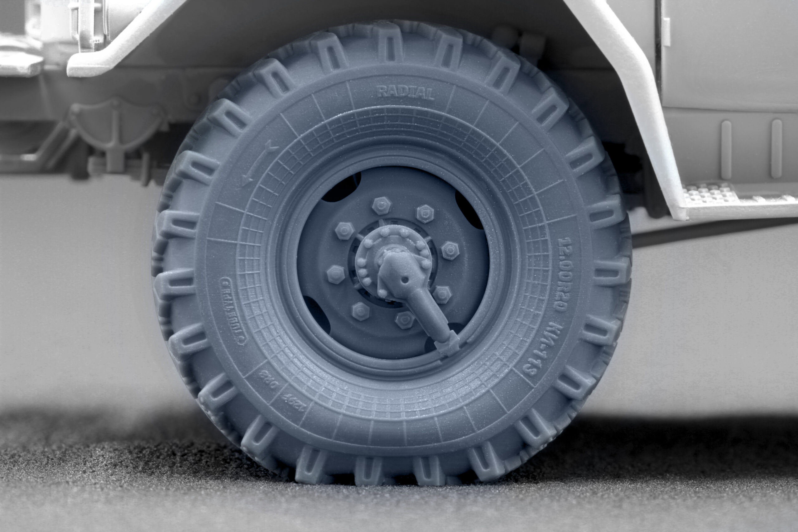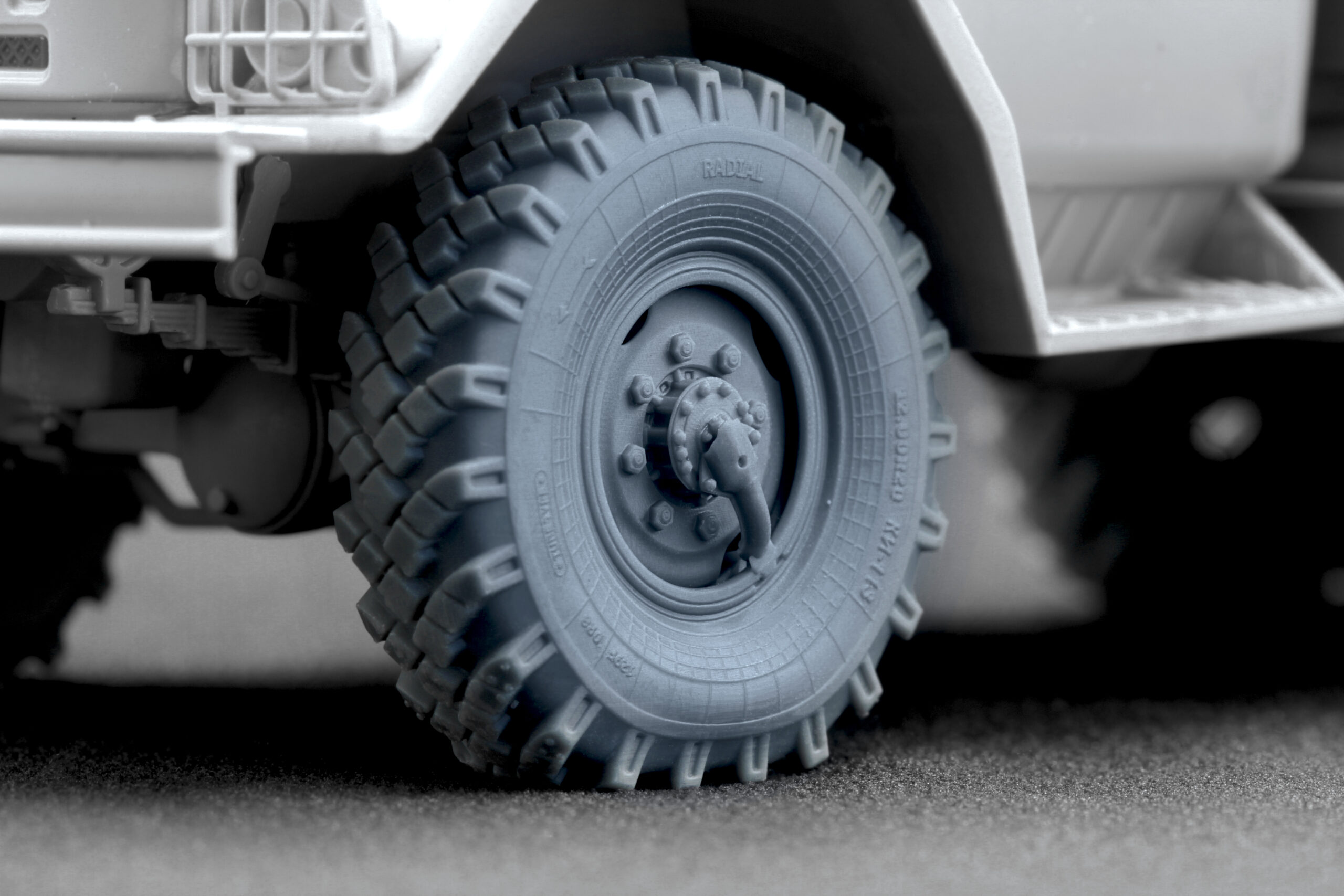 Кожен комплект створено за справжніми прототипами: ми ретельно дослідили фотографії, креслення та технічну документацію, щоб передати малюнок протектора, точну форму дисків та деталі боковин шин. Технологія фотополімерного 3D-друку дозволила досягти чіткості та якості, недосяжної для стандартних пластикових коліс зі звичайних наборів.