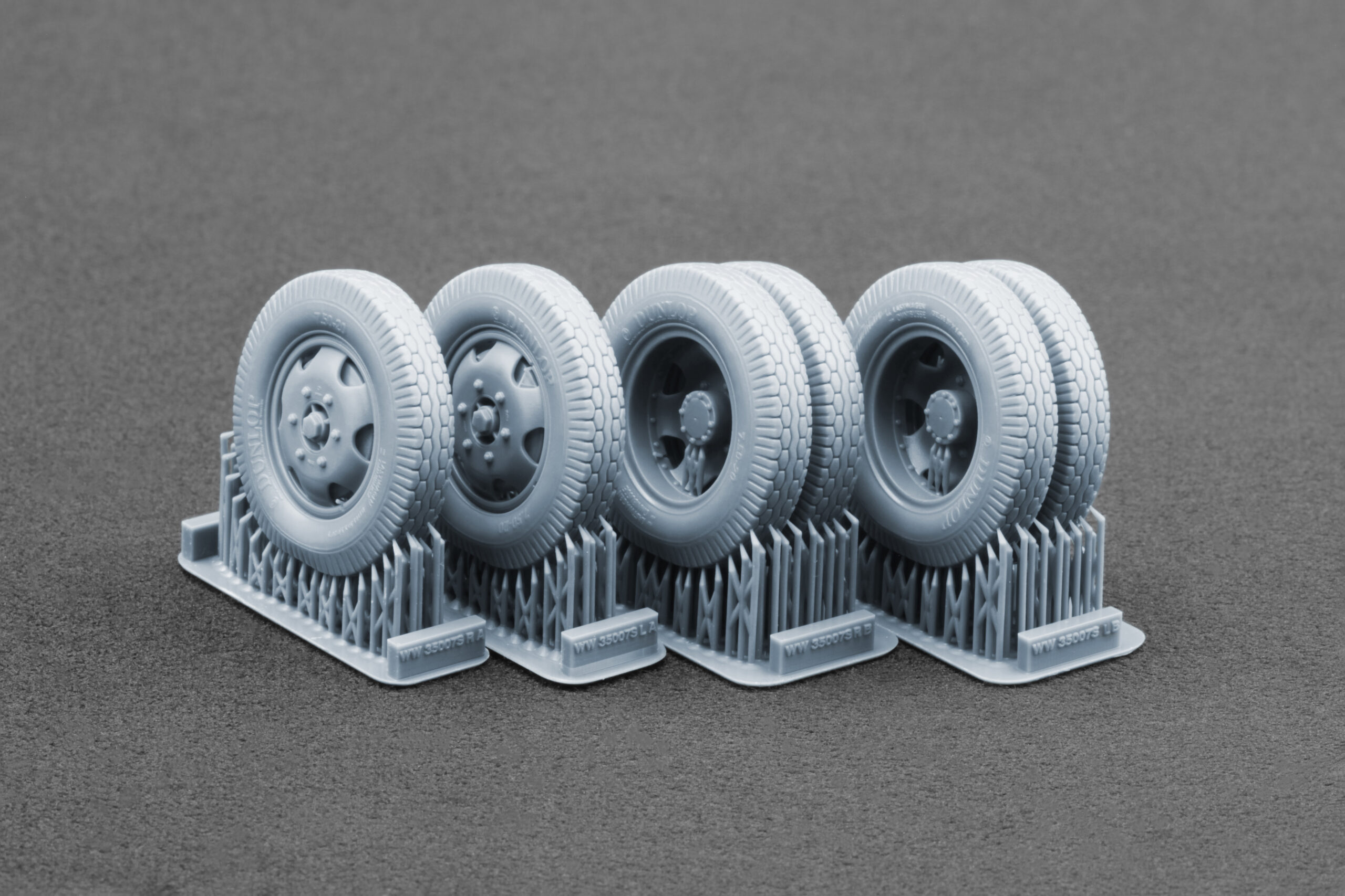 Thanks to high-resolution photopolymer 3D printing, the wheels feature crisp tread definition, sharp edges, and fine surface detail that significantly surpass standard injection-molded kit parts.