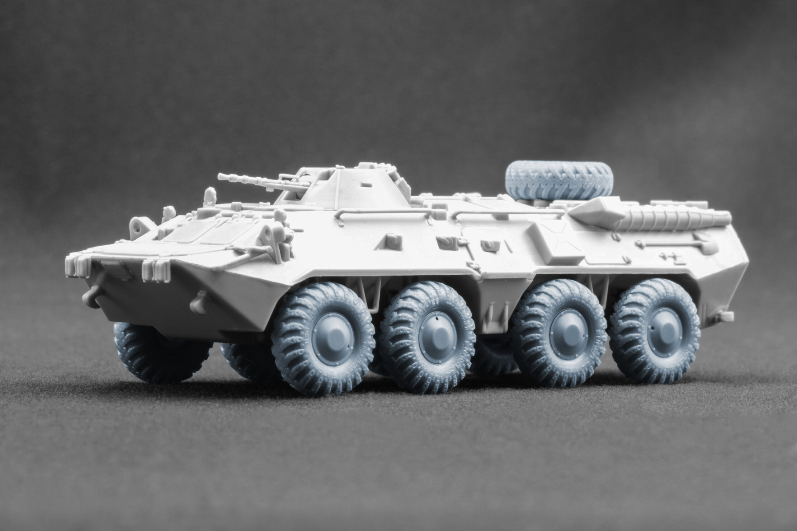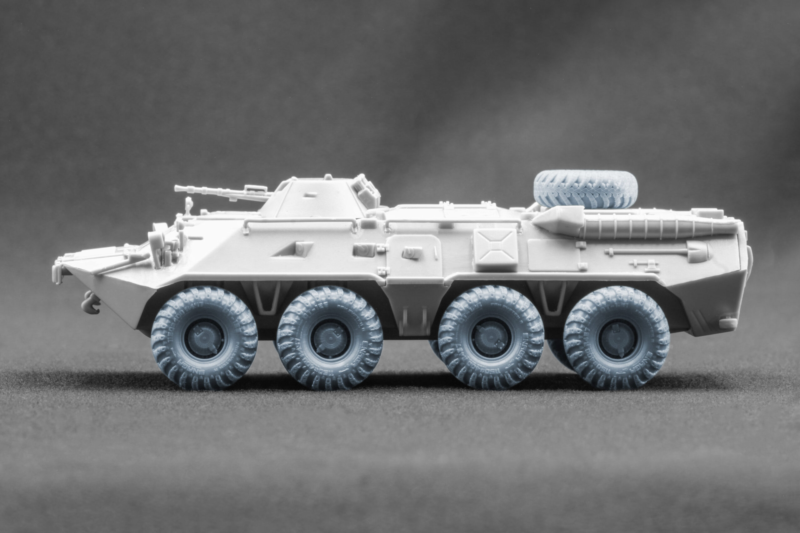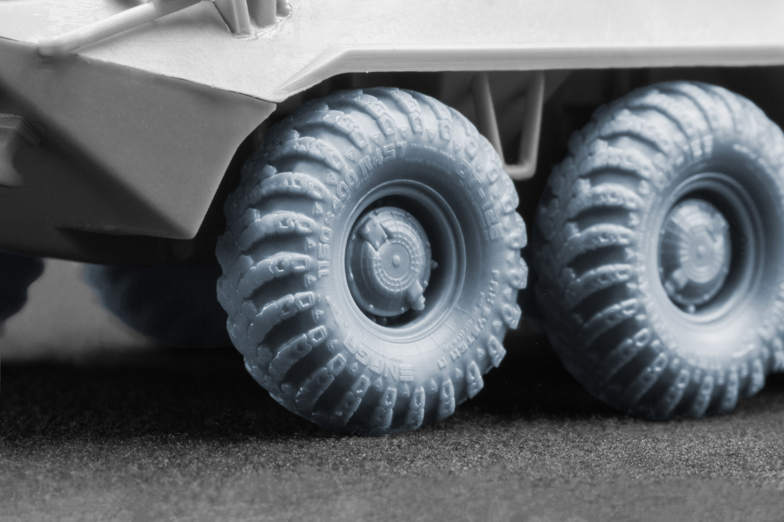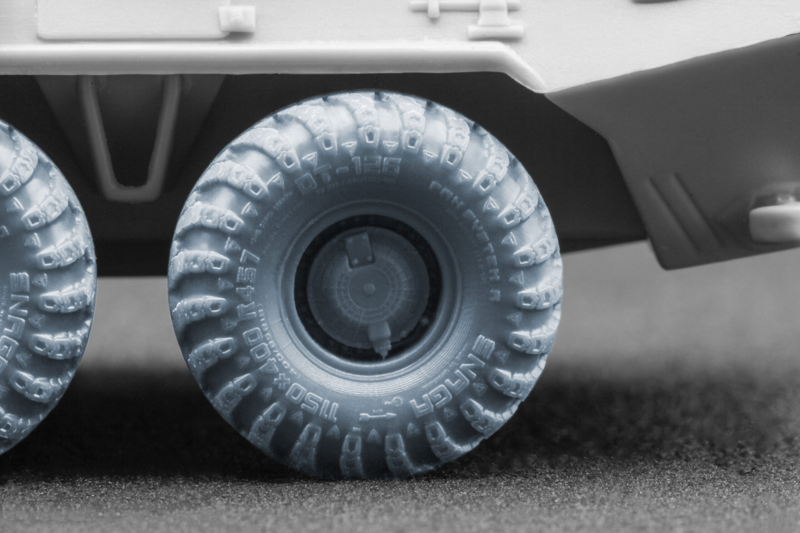 To make your BTR-80 armored personnel carrier model in 1/72 scale look as realistic as possible, we created two versions of 3D-printed wheels in 1/35 scale: Ordinary and Sagged (with a natural weight effect). These wheels accurately reproduce the DT-126 Snaga tire type, making them an ideal choice for modelers who value both historical and technical authenticity.