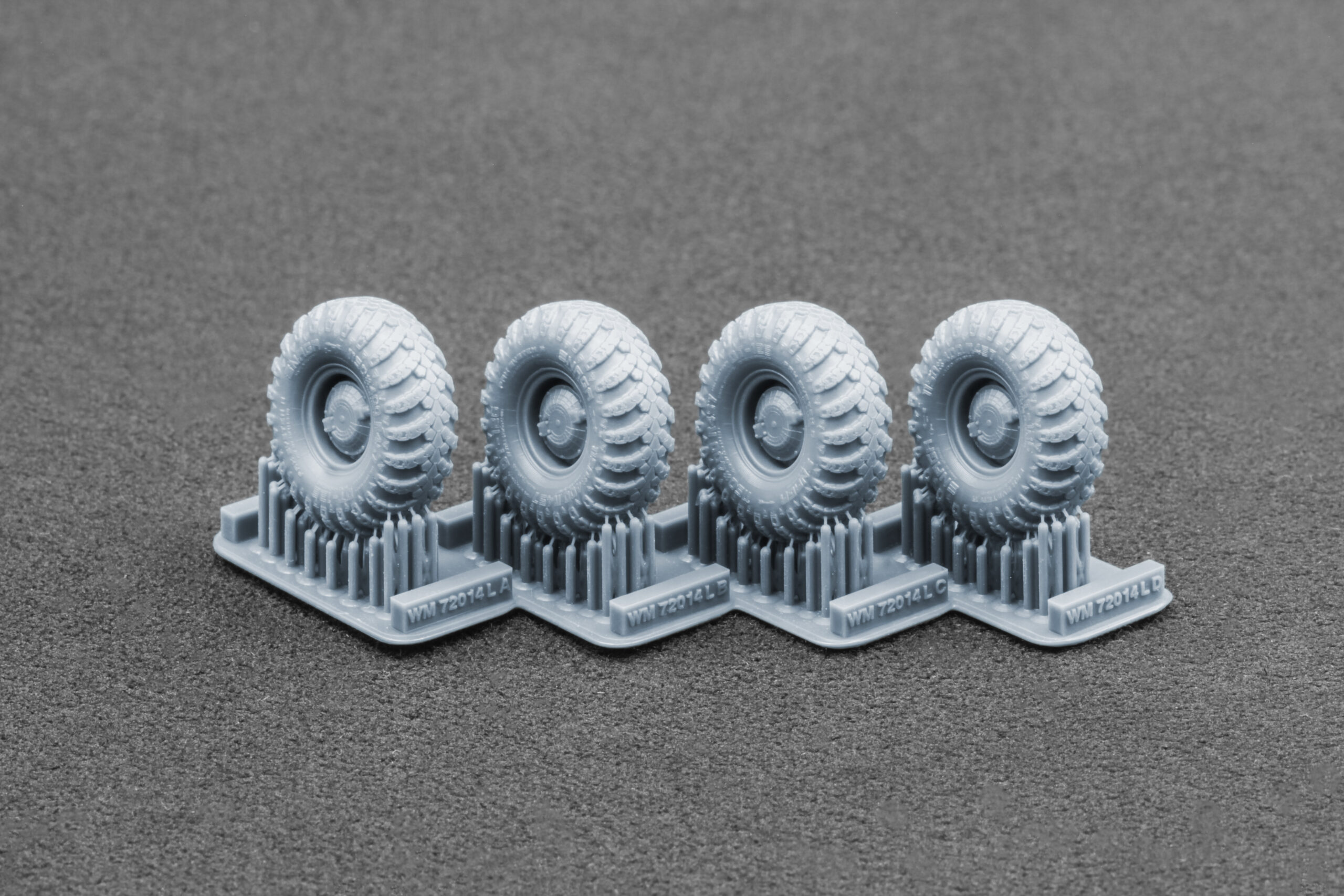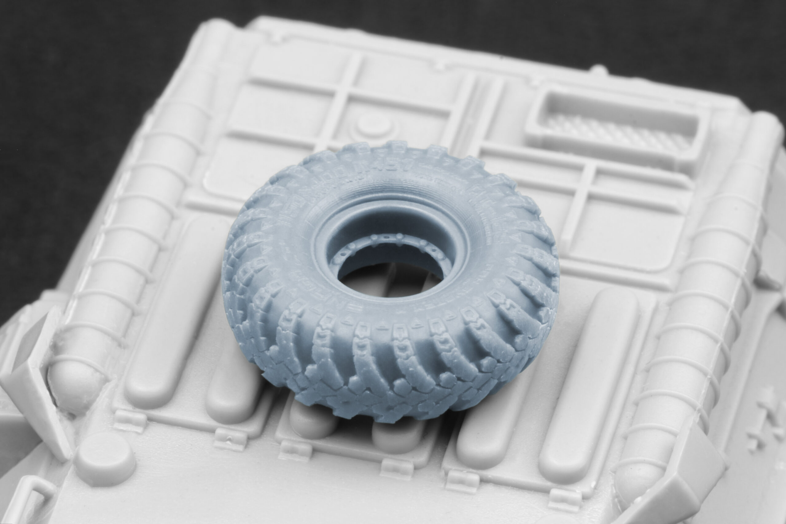 We carefully studied photos, technical materials, and available samples to recreate the tread pattern, sidewall profile, and rim geometry with maximum precision. High-resolution photopolymer 3D printing allows for a level of detail impossible to achieve with standard rubber or injection-molded parts — crisp tread edges, natural sidewall deformation on the “sagged” version, and perfectly shaped mounting surfaces.