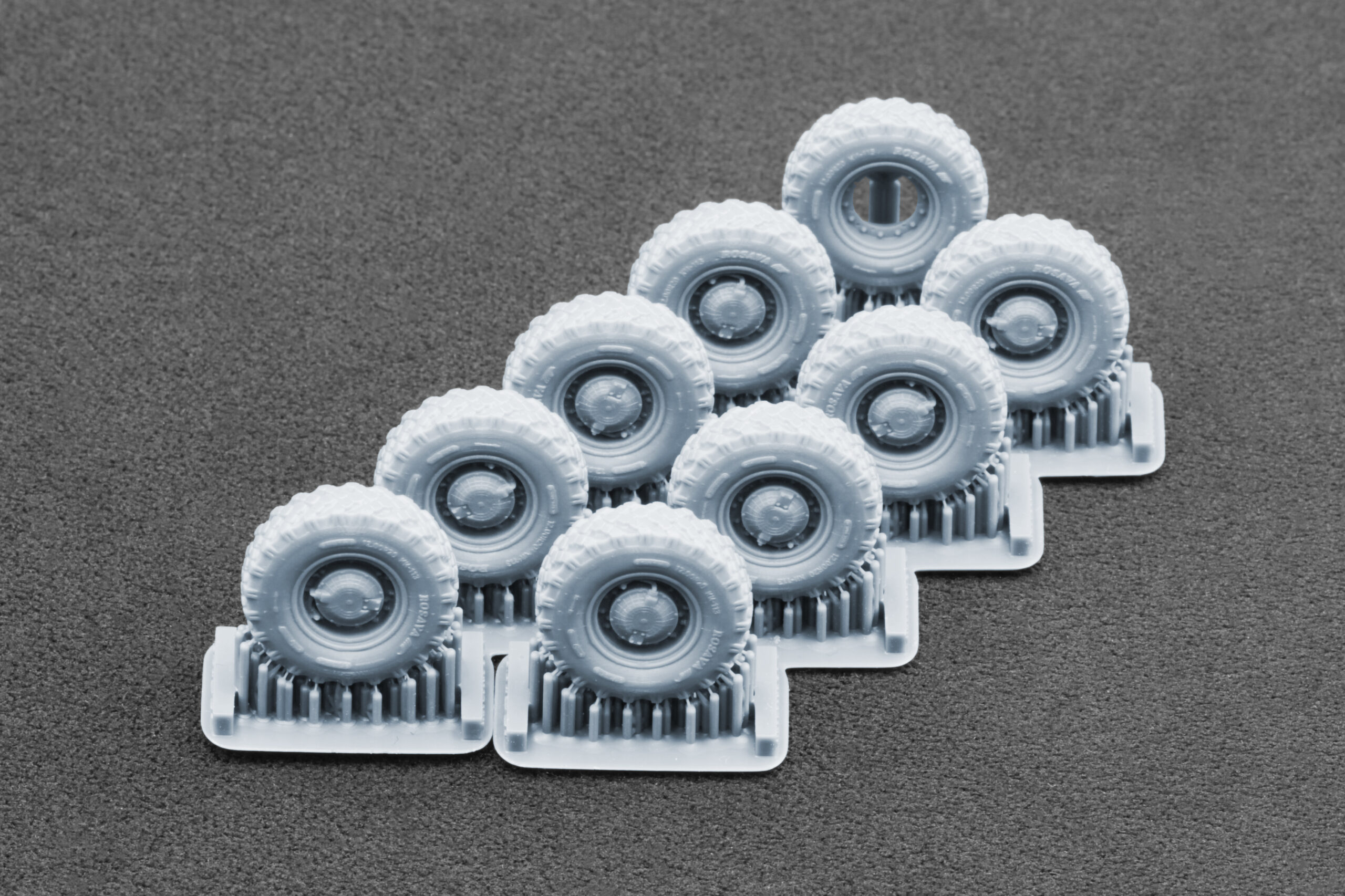 Photopolymer 3D printing delivers a level of sharpness and detail that standard rubber or molded kit parts cannot achieve: crisp tread edges, thin structural elements, accurate mounting surfaces, and a highly realistic wheel stance.