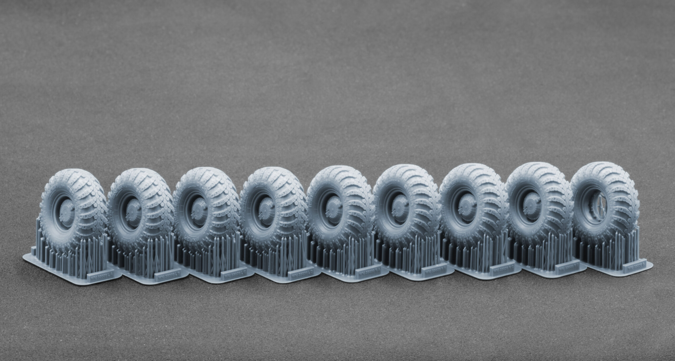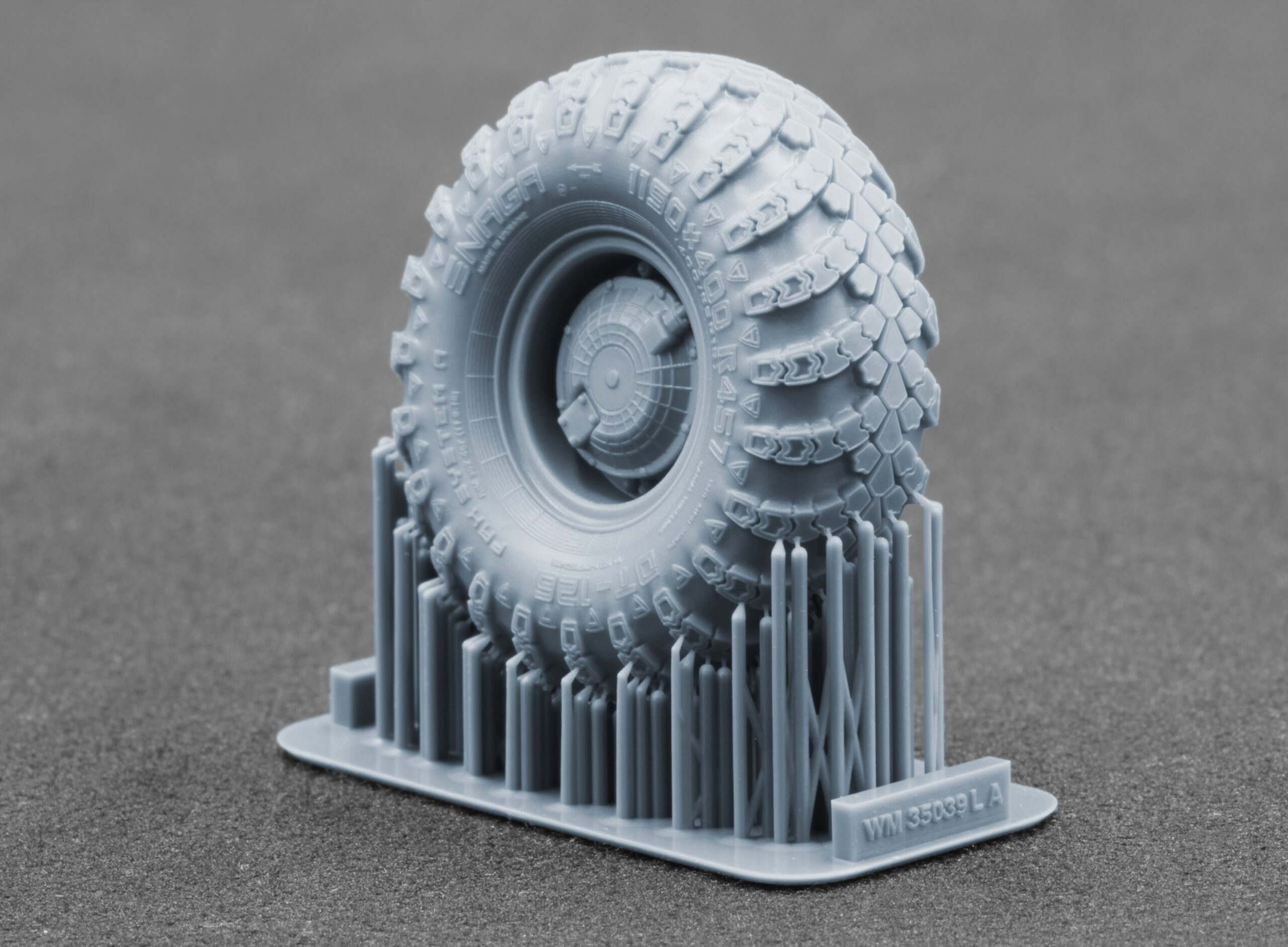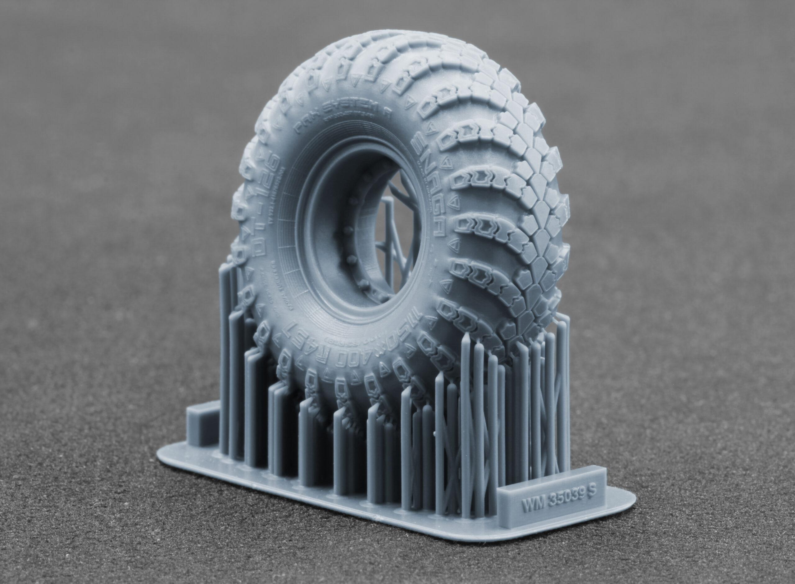 We carefully studied photos, technical materials, and available samples to recreate the tread pattern, sidewall profile, and rim geometry with maximum precision. High-resolution photopolymer 3D printing allows for a level of detail impossible to achieve with standard rubber or injection-molded parts — crisp tread edges, natural sidewall deformation on the “sagged” version, and perfectly shaped mounting surfaces.