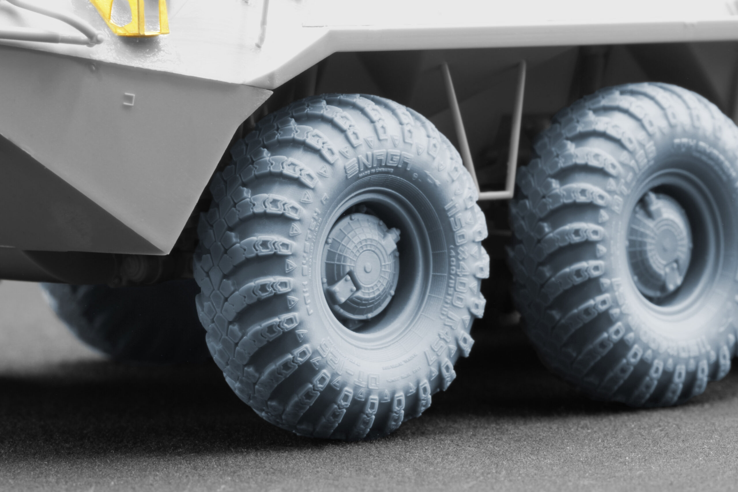 To make your BTR-80 armored personnel carrier model look as realistic as possible, we created two versions of 3D-printed wheels in 1/35 scale: Ordinary and Sagged (with a natural weight effect). These wheels accurately reproduce the DT-126 Snaga tire type, making them an ideal choice for modelers who value both historical and technical authenticity.