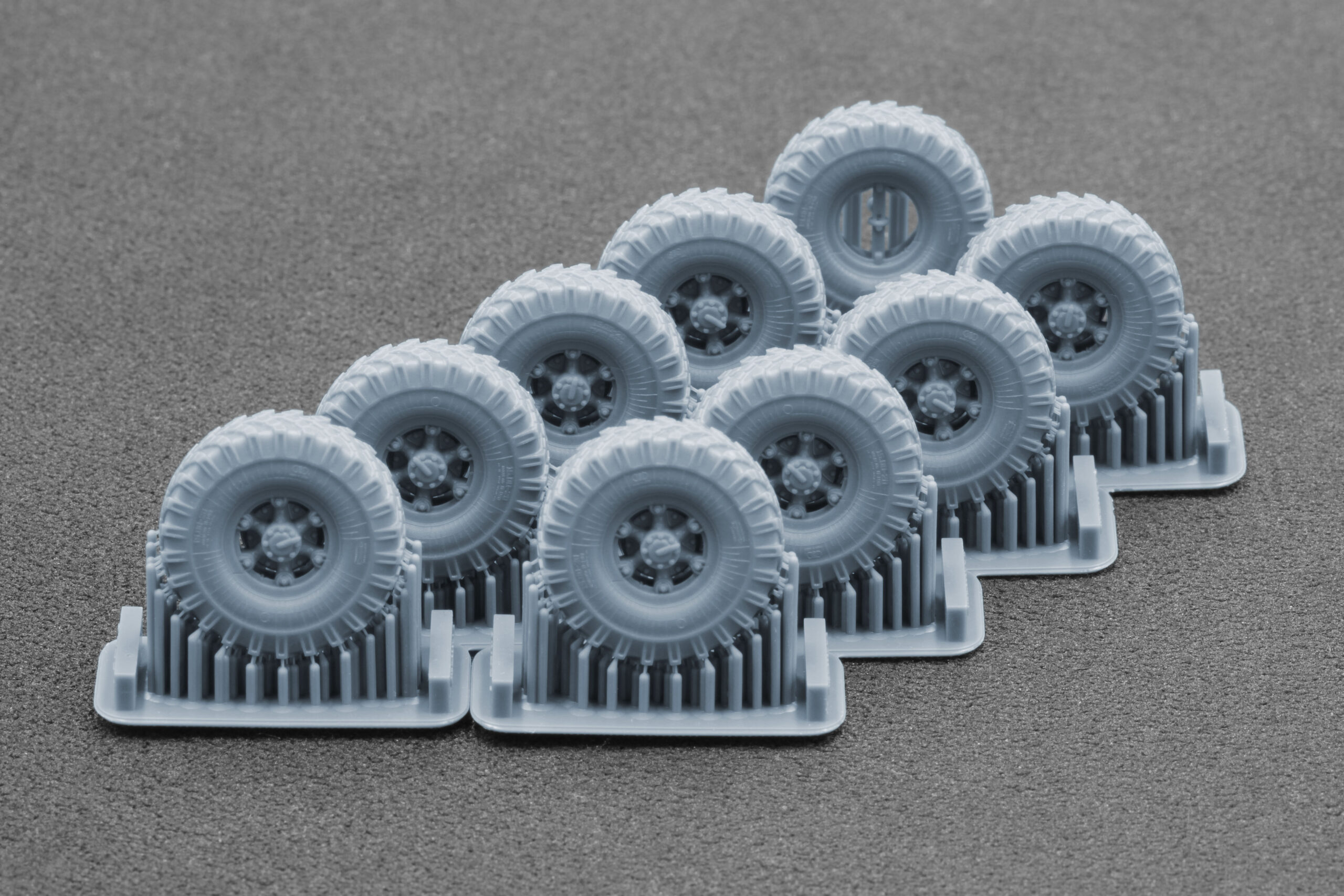 Each wheel was precisely designed based on real prototypes, with accurate tread pattern, sidewall details, and rim geometry. Extensive photo and technical research ensured authentic proportions and the distinctive look of the original wheels.