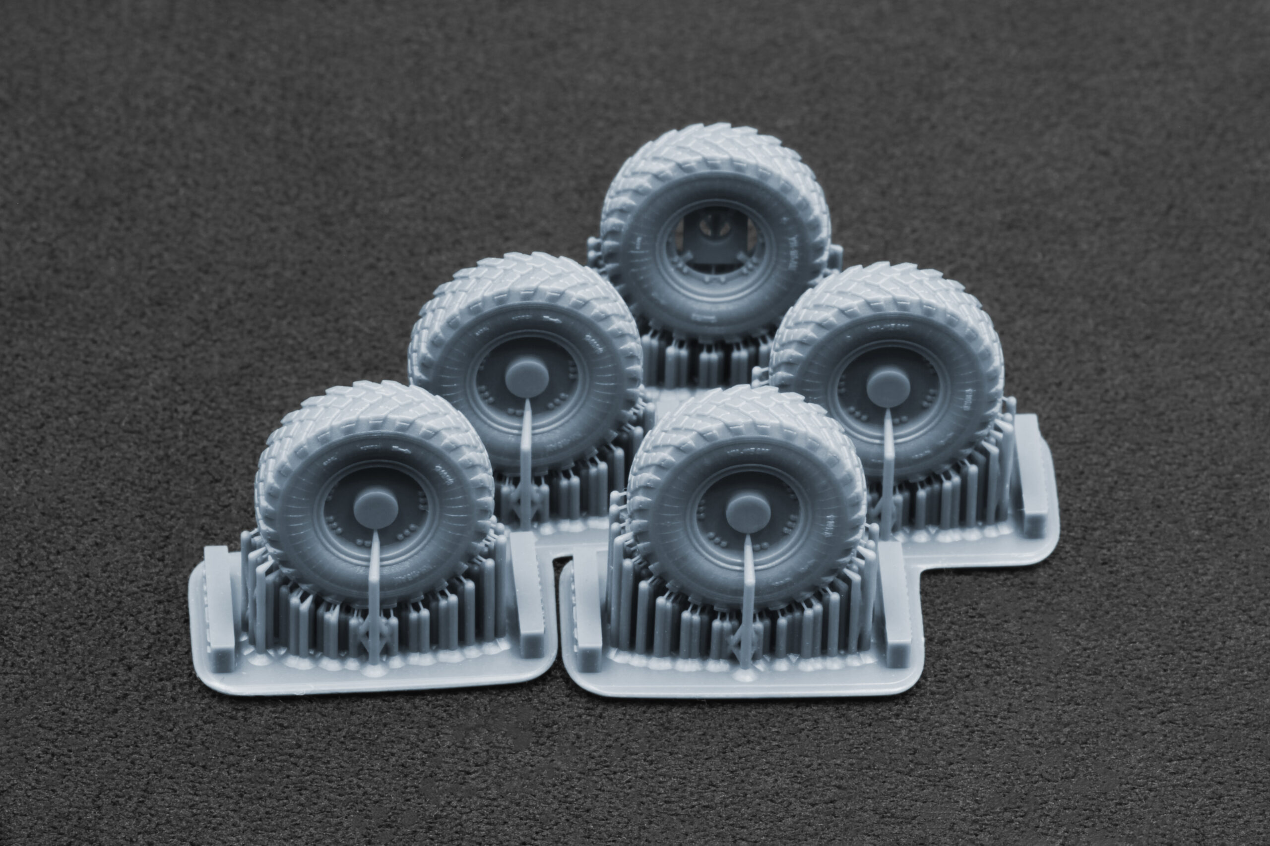 High-resolution photopolymer 3D printing provides crisp details far superior to standard rubber kit wheels — delivering sharp tread edges, clean rim geometry, and realistic surface texture. Whether you choose the ordinary or sagged version, the wheels will add convincing mass, stance, and authenticity to your finished model.
