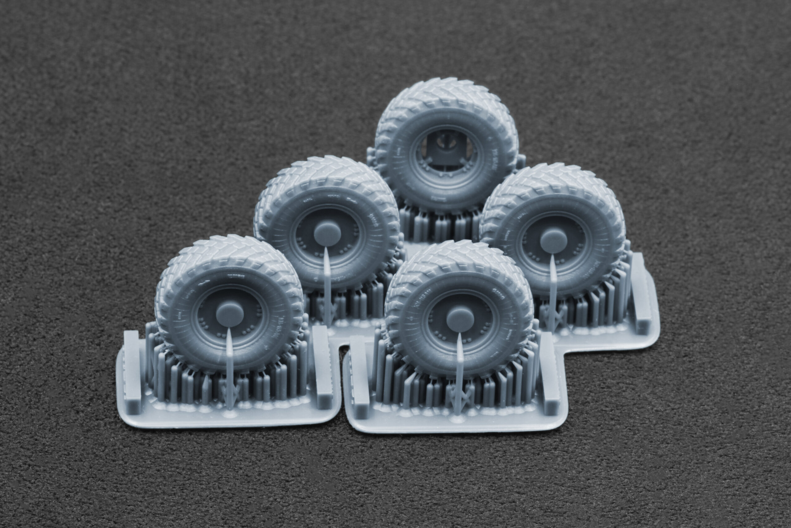 High-resolution photopolymer 3D printing provides crisp details far superior to standard rubber kit wheels — delivering sharp tread edges, clean rim geometry, and realistic surface texture. Whether you choose the ordinary or sagged version, the wheels will add convincing mass, stance, and authenticity to your finished model.