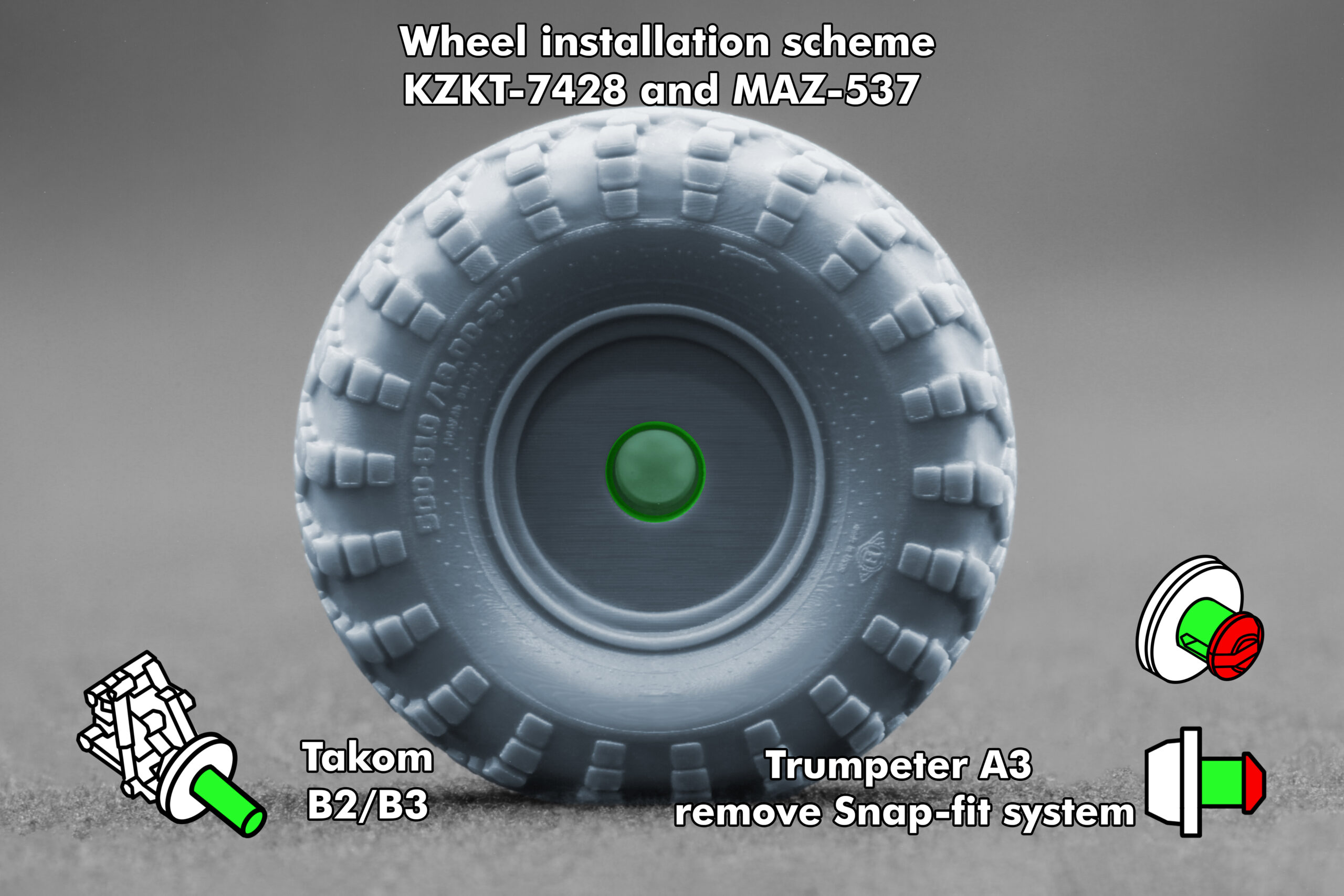 ℹ️ The wheels are designed for Trumpeter and Takom KZKT-7428 kits in 1:72 scale and can also be used on MAZ-537 vehicles, making this set a versatile upgrade option for multiple Soviet heavy tractor builds.