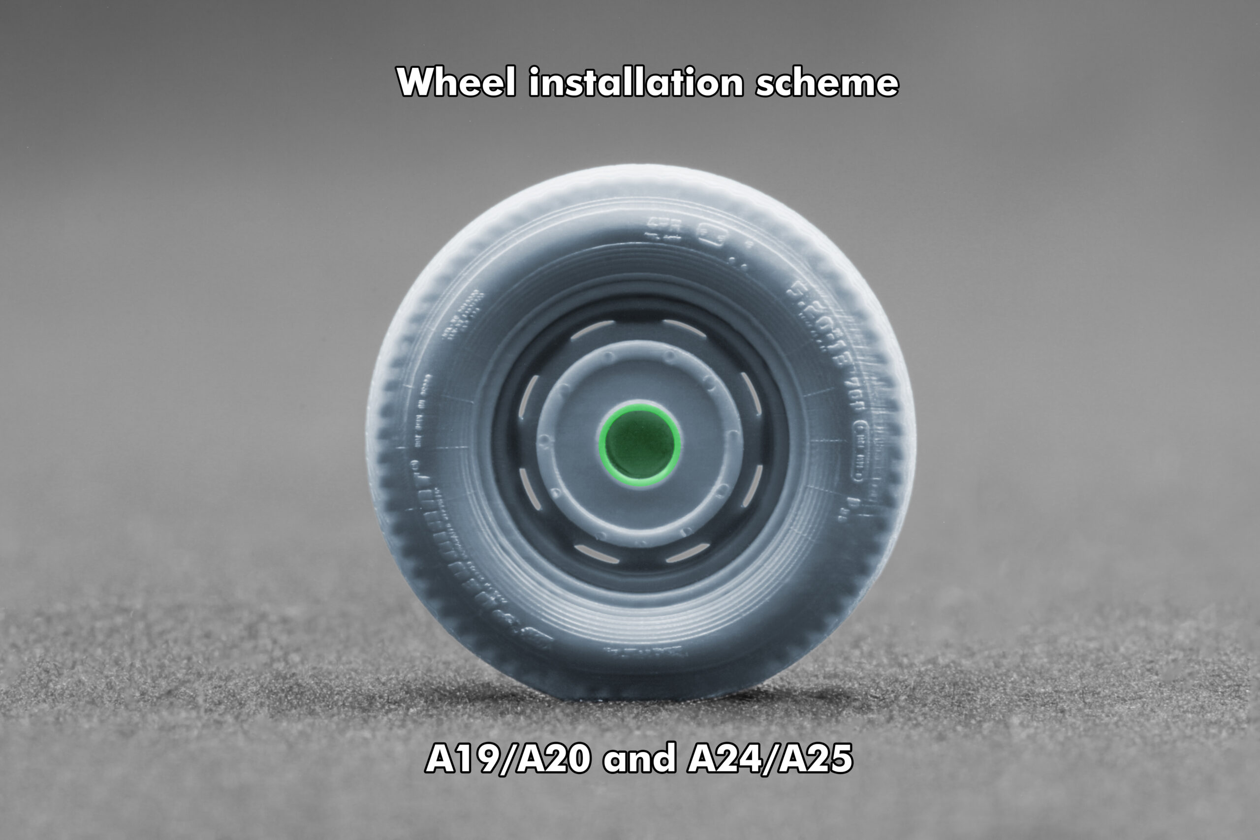 The wheels are designed to fit directly onto the standard mounting points A19/A20 and A24/A25 of AK-Interactive kits without any additional modifications.