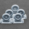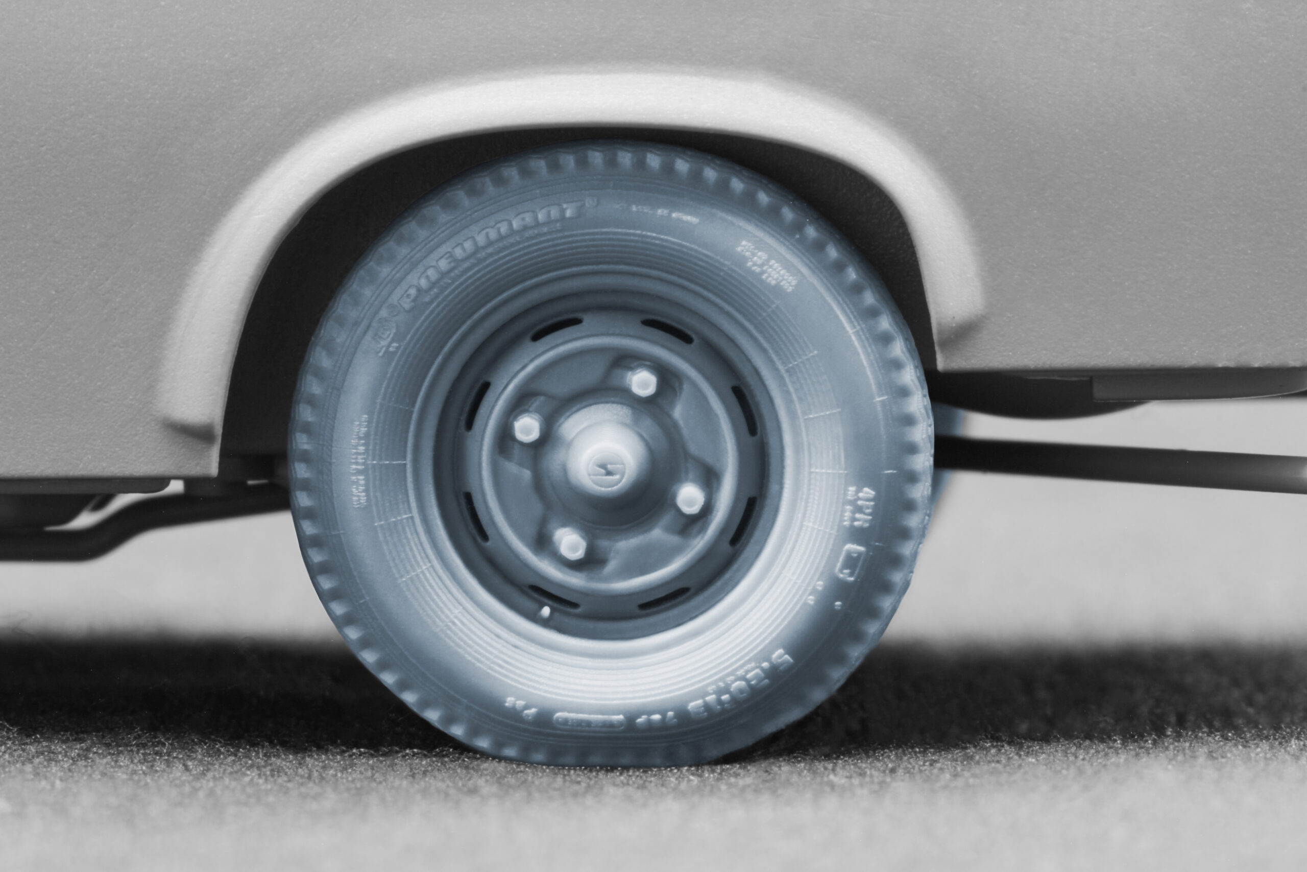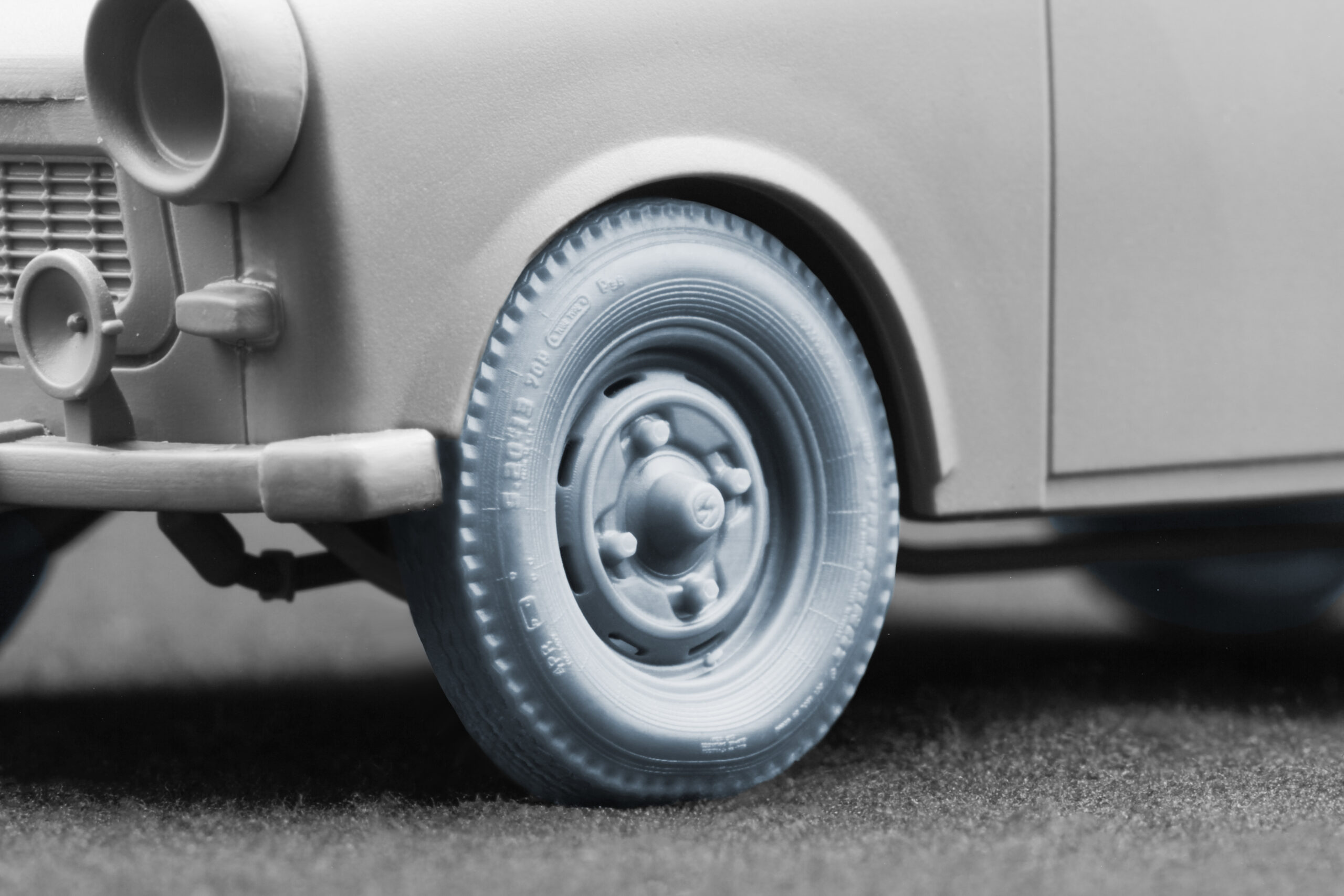 The wheels accurately reproduce the characteristic look of the tires and rims used on the real Trabant 601 S and provide a noticeable upgrade over the standard kit parts.