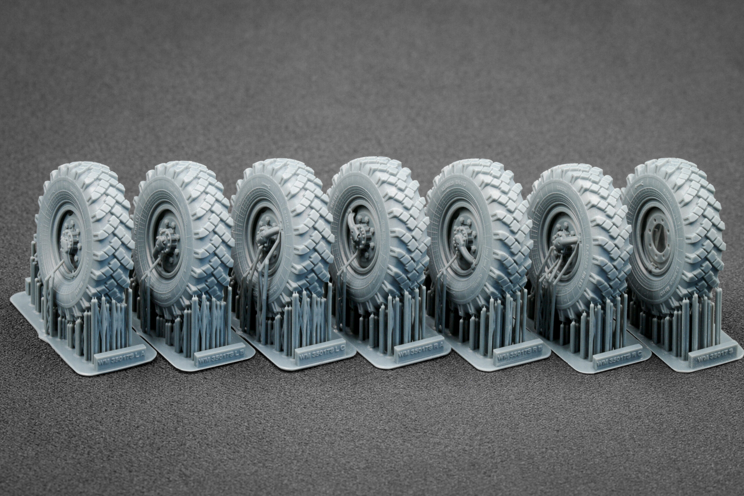 Each set is based on real-life prototypes: we carefully studied photographs, blueprints, and technical documentation to accurately replicate the tread pattern, precise rim shapes, and sidewall details. Photopolymer 3D printing technology allowed us to achieve sharpness and quality that standard plastic wheels from regular kits cannot match.